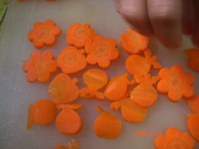 Supaya mudah motong dengan cookies cutter, wortelnya dikupas trus direbus bersama bahan sup yang lain dalam keadaan utuh. Kalau sudah lunak baru diambil, potong tipis dan cetak. Bisa juga untuk mencetak labu siam, dan jenis sayur lain yang agak keras texturenya.