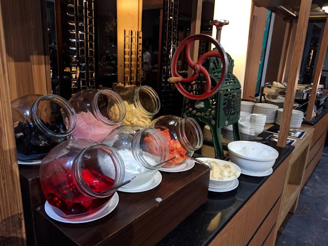 Nah, bagi kamu yang udah sering ke hotel biasanya ada welcome drink yakni apple juice. Nah apple juice, orange juice, dan air mineral ambil ambil dah sampe kembung. Eh tapi ngga hanya itu aja sih, disini ada salad buah buat makanan pembuka, plus ada es kopyor, ambil sendiri!