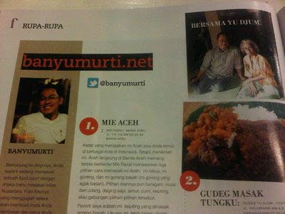 Oh ya, artikel ini muncul di bagian “Wisata Gastronomi ala Blogger” yang menampilkan pilihan kuliner dari 4 orang blogger yaitu Lidia Tanod (lidiatanod.multiply.com), Banyumurti (banyumurti.net), Grace Koesoma (jivekitchen.blogspot.com) dan Adi Taroepratjeka (aditaroepratjeka.wordpress.com). Silakan menikmati sajian lengkapnya di Majalah Femina Edisi Tahunan 2012, dan rajin-rajin tengokin banyumurti.net yahhh… 🙂