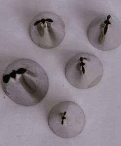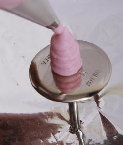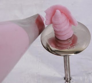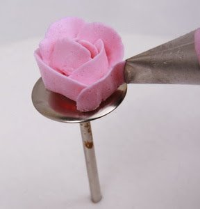 1. Siapkan butter cream di dalam piping bag berisi spuit lubang bulat ukuran sedang. Semprotkan di atas paku mawar membentuk gumpalan lonjong ke atas sebagai dasar kelopak bunga.