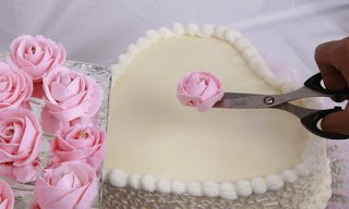 6. Ambil hiasan mawar dengan gunting. Pindahkan ke atas kue tart yang telah disiapkan.