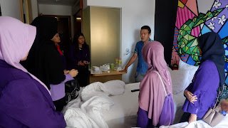 Sebelum me-making bed, housekeeper –diperagakan langsung oleh Lukiy dan dua asistennya– lebih