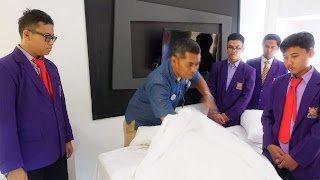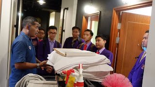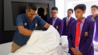 cara me-make up room, praktik making bed  dan belajar teknik dusting oleh Executive Housekeeper