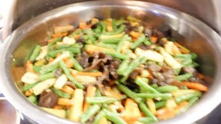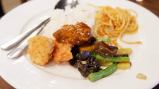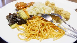 Spaghetti Tomato Garlic, Mix Vegetable Mushroom, Ikan Saus Mayo Combination, Chicken Sauce BBQ, Tahu Petis dan Kerupuk + Aneka Sambal. + Kecap + Acar + Sauce (Condiment).