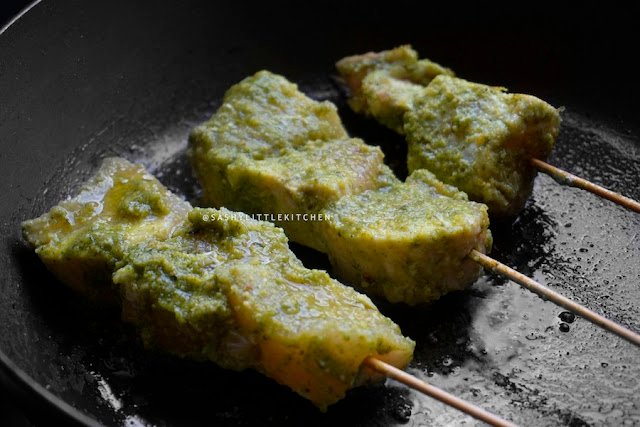 2. Rendam potongan ikan dalam sebagian bumbu pesto, diamkan sebentar hingga bumbu meresap kemudian tusuk dengan tusuk sate. Lakukan hingga ikan habis.