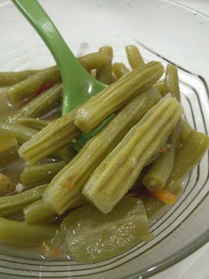 Nah, kalau yang ini adalah buahnya. Di Jawa disebut klenthang. Bentuk mentahnya sekilas seperti gambas atau oyong tapi panjang dan kurus. Kulitnya agak keras berwarna hijau tua.