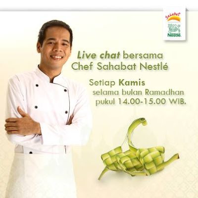 Bagi Anda yang bingung akan mengolah hidangan apa untuk santap sahur praktis, hidangan buka puasa yang lezat, atau membuat kudapan manis untuk berbuka. Jangan bingung, selama bulan Ramadhan, setiap hari Kamis jam 14.00 – 15.00. Fans page Sahabat Nestle bersama Chef Budi akan mengadakan live chat. Anda bisa bertanya apa saja tentang menu Ramadhan, hidangan lebaran, atau kue-kue suguhan hari raya. Salam.