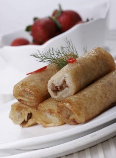 3. Ambil satu lembar kulit, masukkan satu sendok makan bahan isi. Bungkus dan gulung menyerupai risoles/lumpia.