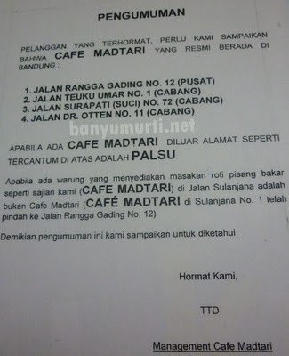 Saya pertama kali mengenal Madtari ketika masih berjualan di kaki lima Jl. Ir H. Juanda (Dago) dan memang pembelinya gak pernah sepi, apalagi kalo malam weekend. Sampai kemudian berpindah ke Jl. Sulanjana dan sekarang bertengger di Jl. Rangga Gading No. 12 dan telah mempunyai 3 cabang yaitu di Jl. Teuku Umar No. 1, Jl. Surapati No. 72, dan Jl. Dr. Otten No. 11. Diluar alamat tersebut PALSU, begitu kata pengumuman yang tersedia di setiap meja πŸ™‚