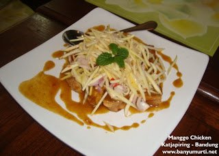 Manggo Chicken, menu unik ini menggabungkan ayam goreng dengan bumbu mangga muda dan cita rasa pedas. Rasanya asam-asam gitu deh. Kalo saya sih gak begitu suka, tapi istri saya bilang menu yang satu ini enak banget. Maklum saya dari dulu gak suka buah asam, buat rujak aja nyarinya buah yang manis. Harga: Rp. 40.000,- (exc. PPN & service charge)