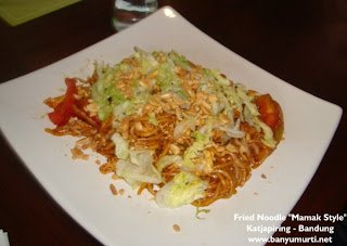 Fried Noodle “Mamak Style”. Mie Goreng khas dari katjapiring yang bercita rasa Jawa dengan rasa pedas yang cukup menghentak dari bumbunya yang cukup “penuh” menghiasi mie, ditambah dengan taburan kacang dan sayuran. Muantabbb deh pokoknya…. Harga: Rp. 26.000,- (exc. PPN & service charge)