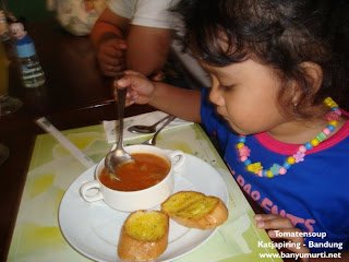 Tomaten Soup, buat yang nyari appertizer atau emang nyari makanan yang lebih light, mungkin bisa coba menu ini. Sup tomat yang asam manis disisipi daging ayam, sangat pas buat dimakan panas-panas buat ngelawan udara dinginnya Bandung. Harga: Rp. 20.000,- (exc. PPN & service charge)