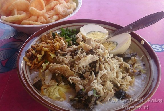 Bubur ayam di kota Bandung punya ciri khas yang berbeda dengan bubur ayam di kebanyakan kota lainnya. Buburnya cenderung sudah gurih dengan aroma kaldu ayam yang menggoda tanpa dibubuhi apapun, sedangkan bubur ayam di kota lain sang bubur akan diberi guyuran “kuah” kuning yang memberikan aroma gurih pada sajian bubur ayamnya. “Topping” di bubur ayam Bandung pun lebih meriah biasanya, di porsi lengkapnya selain suwiran ayam, kacang dan taburan seledri, kita juga bisa menemukan potongan cakue, ati ampela dan telur rebus. Jadi untuk memilih bubur ayam Bandung yang enak, patokan saya cukup dua: gurihnya bubur ayam dan kelengkapan “topping”-nya.
