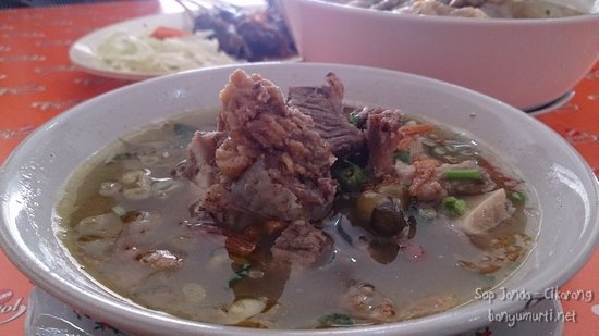 Namanya memang memancing rasa penasaran, Sop Janda. Tapi janda disini ternyata adalah kependekan dari Jawa-Sunda, ya memang katanya racikan menu di tempat makan yang satu ini adalah paduan dari citarasa jawa dan sunda. Entah benar atau tidak. Tapi yang jelas Sop Janda yang berada di kawasan Jababeka Cikarang ini menghadirkan menu utama sop yang berbeda. Perbedaan pertama tampak ketika kita memesan, sang pramusaji langsung menanyakan tingkat kepedasan yang diinginkan, dan hanya dua pilihan yang dia ucapkan: sedang atau pedas. Saya memesan Sop Kaki Janda dengan tingkat kepedasan sedang, harganya satu porsi 55ribu. Terasa mahal tapi ternyata yang hadir semangkuk besar sop dengan potongan kaki sapi yang berlimpah. Ini sih dimakan berdua juga belum tentu habis. Tidak hanya daging, tampak juga cabe rawit yang berlimpah di dalam kuah sop ini. Inilah kunci kesegaran kuah sop ini sekaligus sumber rasa pedas yang menjadi andalan dari Sop Janda ini. Kaki sapi yang kenyal pun memberikan kenikmatan sendiri, sehingga tidak puas menggunakan sendok, akhirnya saya harus “turun tangan” juga.