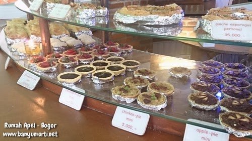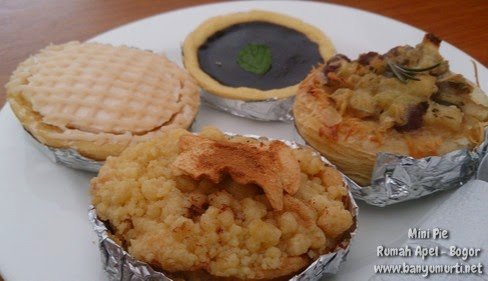 Aneka pie mini tersaji untuk kita pilih, ada chicken pie, cheese pie, strawberry pie, chocolate pie dan tentunya yang menjadi andalan di tempat ini, Apple Pie. Itu semua dapat anda temukan di Rumah Apel, diversifikasi usaha dari Pia Apple Pie, salah satu oleh-oleh dari Bogor yang sudah lama menjadi buruan para wisatawan. Mengambil tempat di sebuah rumah tua di ruas Jl Pangrango, Rumah Apel memberikan sentuhan yang berbeda dengan aneka pilihan produk kudapan yang menggiurkan. Mini Pie yang menjadi andalan Rumah Apel, pie dengan beragam isi dibuat dalam bentuk yang mini. Gara-gara bentuknya yang mini itulah maka rasanya semua pilihan yang ada ingin kita cicipi.