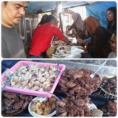 Soto Pak Salam ini memang salah satu legenda kuliner di kota Bogor, tapi terus terang saya baru sempat menyambanginya di bulan Desember tahun 2013 ini. Kenapa? Karena memang jam bukanya yang tidak umum, jam 16 dan habis sebelum jam 7 malam, bukan di waktu jam makan normal. Jika memang tidak memberikan rasa yang special, tentunya tidak akan kedai kecil di pinggir jalan ini selalu disesaki pengunjung yang rela mengantri cukup lama untuk dapat mencicipi hidangan yang disajikan. Ditambah lagi keramahan sang penjaja yang merupakan generasi kedua pemilik kedai ini, dengan celotehan-celotehannya yang menjadi ciri khas. Misalnya: “semangat” untuk pelanggan yang meminta tambahan nasi, “di-setel” untuk meminta pengunjung memilih sendiri isian sotonya, “monitor” menandakan pesanan kita sudah tercatat harganya, “selamat” sebagai pengganti kata terima kasih begitu kita selesai membayar dan masih banyak yang lainnya. Sapaan ini hadir ke setiap pelanggan tanpa kecuali, menjadikan Soto Pak Salam memang tidak hanya hadir di lidah, tapi juga di hati para pelanggannya. “Selamat….”