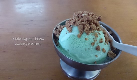 Es Krim, siapa sih yang ga suka dessert yang satu ini? Di setiap sudut kota kita bisa dengan mudah menemukan penjual es krim mulai dari di restoran, supermarket, mini market, halaman sekolah sampai tukang es krim yang berkeliling dengan menggunakan sepeda. Tetapi tidak banyak kita bisa temukan kedai makan yang memang mengkhususkan dirinya berjualan dengan menu es krim, apalagi yang usianya sudah puluhan tahun. Di Semarang dan Malang ada Toko Oen yang legendaris, di Medan kita bisa ke Restaurant Tip Top, ada juga Sumber Hidangan atau Rasa di Bandung, sedangkan di Surabaya ada Zangrandi yang sangat kondang. Bagaimana dengan di Jakarta? Nama Es Krim Ragusa pastinya sudah melekat di para pecinta es krim di ibukota ini. Menempati bangunan vintage di bilangan Jalan Veteran, Es Krim Ragusa menawarkan es krim dengan tujuh rasa utama. Untuk yang regular ada rasa mocca, vanilla, chocolate, strawberry dan nougat. Sedangkan untuk yang premium ada rasa durian dan rum raisin. Ada dua yang jadi favorit saya, yang pertama adalah Es Krim Nougat. Cita rasa kacang yang kuat menyeruak begitu es krim berwarna hijau ini lumer di mulut kita, bukan karena taburan kacang di atasnya, tapi memang es krim nougat ini mengusung rasa kacang yang jarang kita jumpai di sajian es krim lainnya. Sementara rasa favorit saya yang kedua adalah Es Krim Durian, jangan bayangkan rasa durian yang muncul seperti es krim puter duren yang banyak kita temui di kaki lima. Rasa duriannya sangat halus dibalut dengan tekstur es krim yang memang lembut, tidak berlebih tapi juga tidak kehilangan rasa duriannya. Seporsi es krim standard ini kita bisa nikmati dengan harga Rp 15-20 ribu.