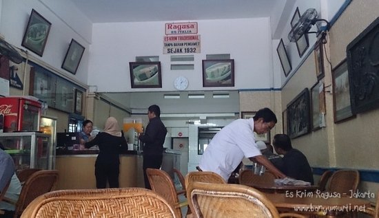 “Ragusa, Es Italia. Es Krim Traditional. Tanpa Bahan Pengawet. Sejak 1932” Jejeran kalimat tersebut terpasang di dinding tengah dari bangunan Belanda yang ditempati kedai ini sejak tahun 1947, setelah sebelumnya es krim ragusa dijajakan di Pasar Gambir (Jakarta Fair) sejak tahun 1932. Itulah info yang saya dapat dari Wikipedia. Entah saat ini sudah dikelola oleh generasi ke berapa, tetapi cita rasa yang dipertahankan memang menjadikan Es Krim Ragusa ini dapat bertahan sampai sekarang dengan pelanggan yang juga sudah berganti generasi.