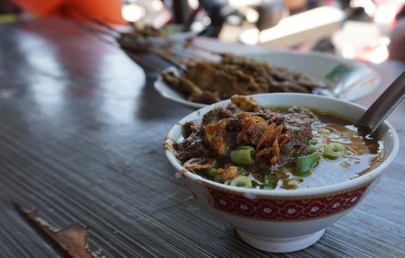 Kuah serupa soto yang segar yang berwarna pekat dengan parutan sangrai kelapa yang dibiarkan “mengotori” semangkuk nasi, plus potongan daging sapi yang gurih dan taburan bawang daun, seolah mengharuskan kita yang tengah melintasi kota Pemalang untuk mencicipi Nasi Grombyang ini. Apalagi ditambah dengan sate sapi dalam balutan bumbu kelapa yang legit sebagai pelengkapnya.