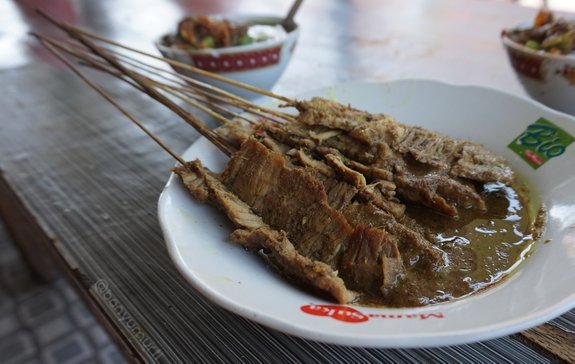 Tak hanya sajian nasi grombyangnya, tersaji pula piring yang penuh dengan sate daging sapi yang sulit untuk ditolak panggilannya. Tapi tunggu dulu, sate ini tidaklah seperti layaknya sate yang biasa kita santap. Sate ini terbalut bumbu kelapa yang menghadirkan rasa gurih dari kelapa berpadu dengan semburat rasa manis. Sangat cocok untuk dipadupadankan dengan hidangan utama sang nasi grombyang. Porsi mangkuk yang kecil pun membuat kita tak sadar menghabiskannya dalam waktu singkat, dan segera berujar “Mas, satu lagi!”