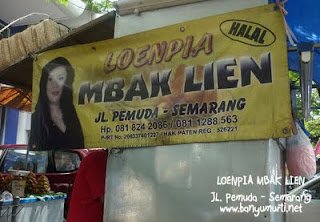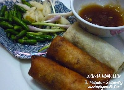 Satu makanan yang selalu harus-wajib-kudu saya datangi kalo ke Semarang adalah Lunpia. Gak pernah nemu lunpia Semarang di kota lain yang rasanya bener2 sama dengan aslinya di kota ini. Pulang dari Nasi Goreng Babat Pak Karmin, sekitar 500m dari jembatan Mberok masih di Jl Pemuda, ada satu gang (Gg Grajen) yg memasang spanduk Loenpia Mbak Lien di depannya. Yup, ini adalah salah satu penjaja loenpia Semarang yang cukup melegenda di kota ini. Tersedia dua jenis, Lumpia basah ataupun kering (sudah digoreng). Tapi jangan khawatir, yang basah juga udah mateng koq, sudah siap disantap. Kelebihan dari Loenpia Mbak Lien ini emang pada isinya yang lebih padat dengan rasa yang lebih legit dan nendang banget, perpaduan antara rebung segar, telur, udang dan ayam kampung. Hmmm… apalagi makannya dilengkapi dengan saus kanji yang khas, acar timun, bawang dan cabe rawit. Perfecto!