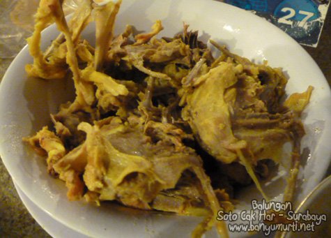 Satu lagi yang tidak bisa saya lupakan dari Soto Cak Har ini adalah kita bisa minta Balungan. Apa itu? Tulang belulang ayam yang sudah “dilucuti” dagingnya sehingga tinggal tersisa tulang-tulangnya saja. Apa enaknya? Walau hanya tulang, jangan lupa bahwa ini adalah tulang ayam yang sudah diolah dengan proses memasak yag panjang sehingga tulangnya sudah lunak dan resapan bumbunya pun sangat terasa. Belum lagi serpihan daging yang tidak bersih dilucuti dari tulangnya ini pun tidaklah sedikit, bisa kita nikmati. Mantap lah pokoknya, memberikan sensasi tersendiri. Dan mau tau berapa harga satu mangkok penuh balungan ini? GRATIS! Makin mantaaaabbbbb….