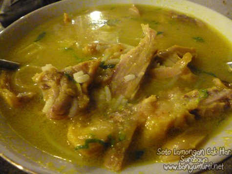 Soto memang menjadi kuliner Indonesia yang mempunyai keragaman yang kaya. Banyak daerah memiliki soto khasnya dengan cita rasa yang berbeda. Kalo di Jawa Timur, Soto Lamongan menjadi salah satu jawara yang merambah ke banyak kota di Indonesia. Di Surabaya ada Soto Lamongan yang kondang, Soto Lamongan “Cak Har” namanya. Saya diajak mas Frenavit yang mengiming-imingi kedahsyatan soto ini. Mari kita buktikan, saya pesan satu soto campur. Eh bentar dulu, ternyata walaupun hanya soto ayam, isi soto ini bisa kita pesan secara “customize”, mau bagian dada, paha, kulit, jeroan atau bahkan brutu. Selain itu kita juga bisa pesan menu tambahan, misalnya ceker ayam, kulit, dan juga balungan alias tulang belulang. Bagaimana dengan sotonya? Pertama saya terkaget dengan kecepatan munculnya pesanan di meja, kurang dari 5 menit! Kedua, berbeda dengan soto lamongan lainnya, soto Lamongan Cak Har menggunakan santan yang membuat kuahnya lebih kental dan tentunya lebih gurih. Ketiga, taburan bubuk koya yang memperkaya rasa, tidak hanya berlimpah, tapi kita bisa menaburkan sesuka hati karena tersedia secara bebas di meja. Keempat, daging ayam kampung pilihan tidak bisa tidak menjadi kunci keunggulan soto Cak Har. Kesimpulan: JUARA! Dan itu semua cukup ditebus dengan harga Rp. 13rb saja satu porsinya.