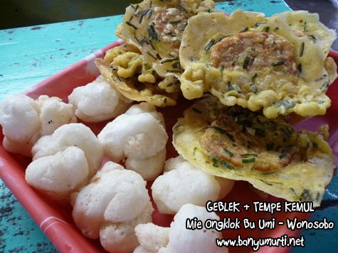 Yang tidak boleh dilewatkan sambil makan mie Ongklok ini adalah kudapan khas yang tersaji di meja: Geblek dan Tempe Kemul. Geblek ini mirip dengan cireng kalo dari tatar Sunda, tetapi tidak terlalu asin. Saya sih kalo di rumah seneng makan geblek yang dicocol dengan bumbu pecel. Kalo Tempe Kemul adalah irisan tempe tipis yang digoreng dengan kemul alias selimut tepung yang juga diberi cacahan daun kucai. Gurihh.. Satu porong gorengan ini harganya Rp. 600.