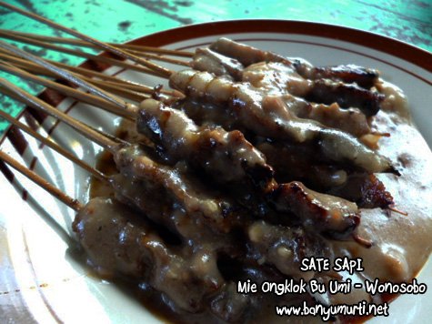 Makan Mie Ongklok tidaklah lengkap jika tidak ditemani dengan sate sapi. Ya, buat saya mie ongklok itu harus di-jejerke dengan sate. Sate sapi yang dihidangkan di kedai Bu Umi ini juga sederhana, dengan potongan daging yang kecil-kecil, dan bumbu kacang yang halus dan manis. Bumbu kacangnya ini sebenarnya yang akan memperkuat rasa kuah “jenang” dari mie ongklok, jadi biasanya saya ambil bumbu sate ini untuk dicampurkan dengan kuah mie ongklok sehingga menciptakan rasa yang paripurna. Nyosss…. Satu porsi sate sapi berisi 10 tusuk ini harganya Rp. 14.000.