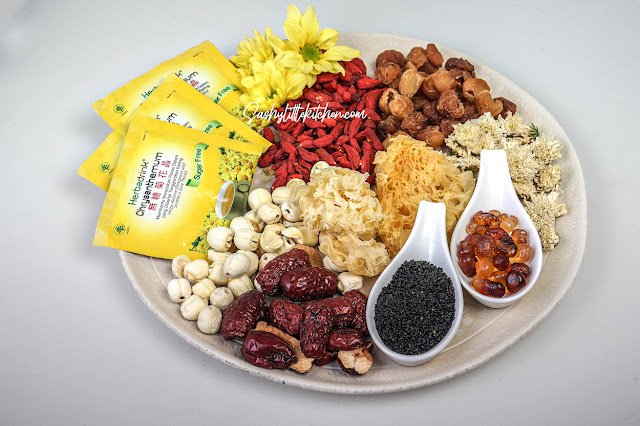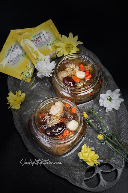 note: dalam paket asli terdapat 2 jenis gula batu serta manisan buah kundur. Ketiga bahan ini tidak saya pakai dan saya gunakan Herbadrink Chrysanthemum sugar free sebagai pengganti gula untuk memberikan rasa manis sekaligus aroma wangi dari bunga krisan