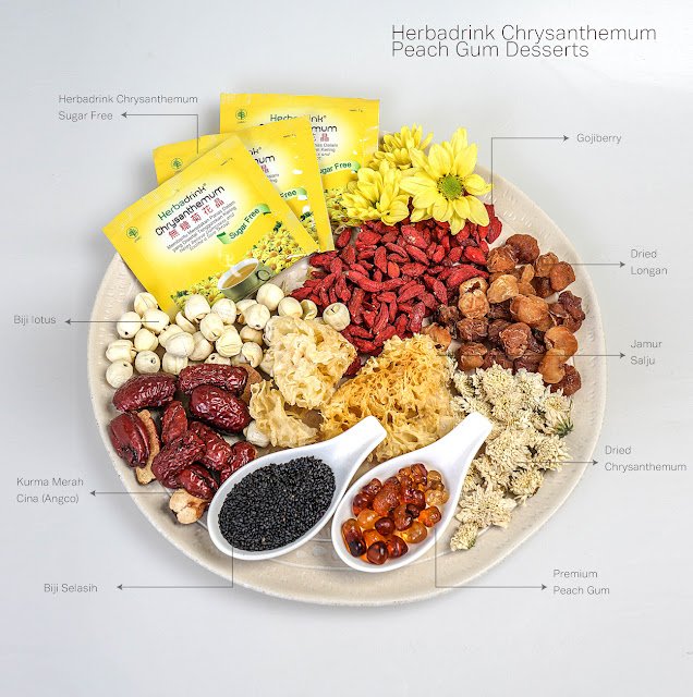 Belakangan ini peach gum muncul sebagai primadona yang sedang naik daun, setelah digunakan dalam resep sajian pencuci mulut yang dicampur dengan berbagai bahan alami lainnya. Mumpung punya stock peach gum dan teman-temannya yang saya beli dalam satu paket praktis, jadi tiba-tiba kepikiran bagaimana kalau peach gum dessertsnya digabungkan dengan Herbadrink Chrysanthemum sugar free untuk menggantikan 3 jenis gula yang terdapat dalam paket peach gum desserts. Alasannya sih sederhana, walaupun dikatakan gula batu, gula semut atau gula dari buah tapi setelah saya cek takaran dari masing-masing gula dalam satu paket tergolong tinggi, jadi nanti malah bukan menyehatkan tapi bikin pipi makin bulet.