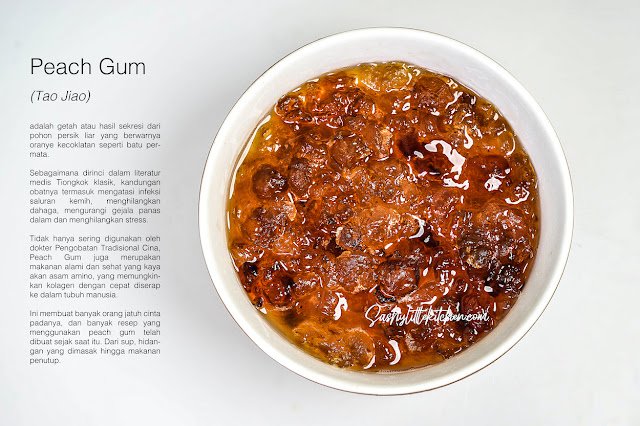 Peach gum sendiri merupakan hasil sekresi atau getah dari pohon peach liar di dataran Cina yang telah mengalami proses pengerasan sehingga bentuk akhirnya seperti batu permata berwarna oranye kecoklatan yang transparan. Menurut literatur pengobatan di Cina peach gum sudah digunakan sebagai salah satu bahan obat sejak lama dan karena texturenya yang lembut kenyal setelah di rendam serta memiliki rasa yang plain atau hambar maka sejak saat itu juga peach gum banyak digunakan dalam resep masakan terutama desserts.