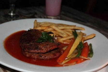 Cari steak porsinya mantab? Datang langsung ke Myoozik Café, disini ada tenderloin steak dua tingkat, dijamin kenyang dan tentunya sesuai dengan bandrolnya Rp 35.000. untuk sauce nya bisa memilih sesuai selera, dari BBQ, Black Papper, dll. Tempatnya yang cozy cocok sekali buat nongkrong dengan teman-teman atau sekdar diner dengan pasangan. Selain itu Myoozik juga menjadi tempat kumpulnya komunitas salsa. Jadi selain menikmati tenderloin steak kita juga dihibur dengan tarian salsa.