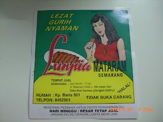 Lunpia Semarang langganan keluarga kami adalah Lunpia Mataram, jualannya pagi sampai siang di depan toko roti Sanitas, jalan Mataram. Sepanjang jalan Mataram, ada banyaaaaaaaaaaak sekali penjual yang mengatas namakan ‘Depan Toko Roti Sanitas’, tapi menurut aku, yang ini yang enak :