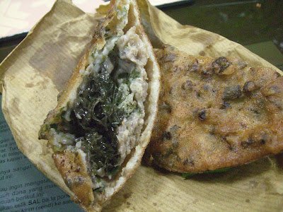Ote ote dengan diameter 10 cm ini dijual Rp 8,000 perbijinya. Dulu waktu aku masih kerja di kantor Pandaan, sering beli 1 besek (isi 10) dan distock di kulkas. Kalau mau makan tinggal dipanasin, either digoreng lagi atau dioven sebentar. Tapi karena keseringan beli, lama lama bosen juga, kerasa enegh.