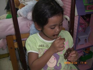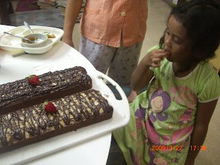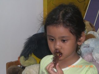 Pulang berenang, Cinta buru buru menghabiskan nasinya supaya boleh maem Brownies…and she loves it. Pok juga suka, terutama bagian atasnya yang renyah dan banyak coklatnya..bener bener Chocolate Moster..hihih…