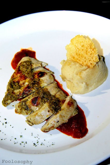 Hidangan ini berupa dada ayam yang diisi dengan saus pesto dan dipanggang serta disajikan dengan tomato concasse dan mashed potato sebagai pelengkapnya. DI bagian atas dada ayamnya masih dilumuri oleh saus pesto sebagai penambah rasa. Daging ayamnya juicy dan gurih dengan wangi pesto yang meresap ke dalam daging. Mashed Potatonya one of the best I’ve ever tasted. Super creamy, smooth and so cheesy.