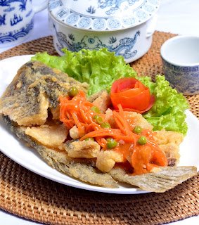 4. Panaskan minyak banyak, goreng gurami hingga matang dan berwarna kuning kecokelatan. Angkat.