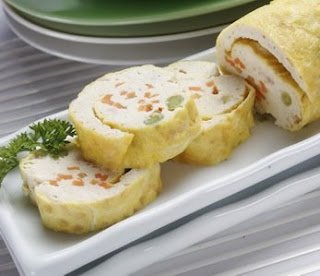 - Ambil satu lembar telur dadar, tuang campuran adonan tahu, ratakan. Gulung dan padatkan. Bungkus dengan kertas aluminium foil atau daun pisang. Kukus selama 40 menit atau hingga matang. Angkat. Potong-potong, sajikan hangat.