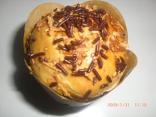 Lalu olesi kuning telur, taburi muisyes dan parutan keju dan sebagian dibiarkan polos….kemudian di oven selama 15 menit. Pada saat mengoven, paper cup saya masukkan kedalam cetakan bolu hongkong dan biar rapi saya masukkan lagi ke dalam cetakan muffin…dobel dobel ya…habis gatel pengen pake cetakan bolu hongkong yang baru beli di Arlisah Amari..hihih…….